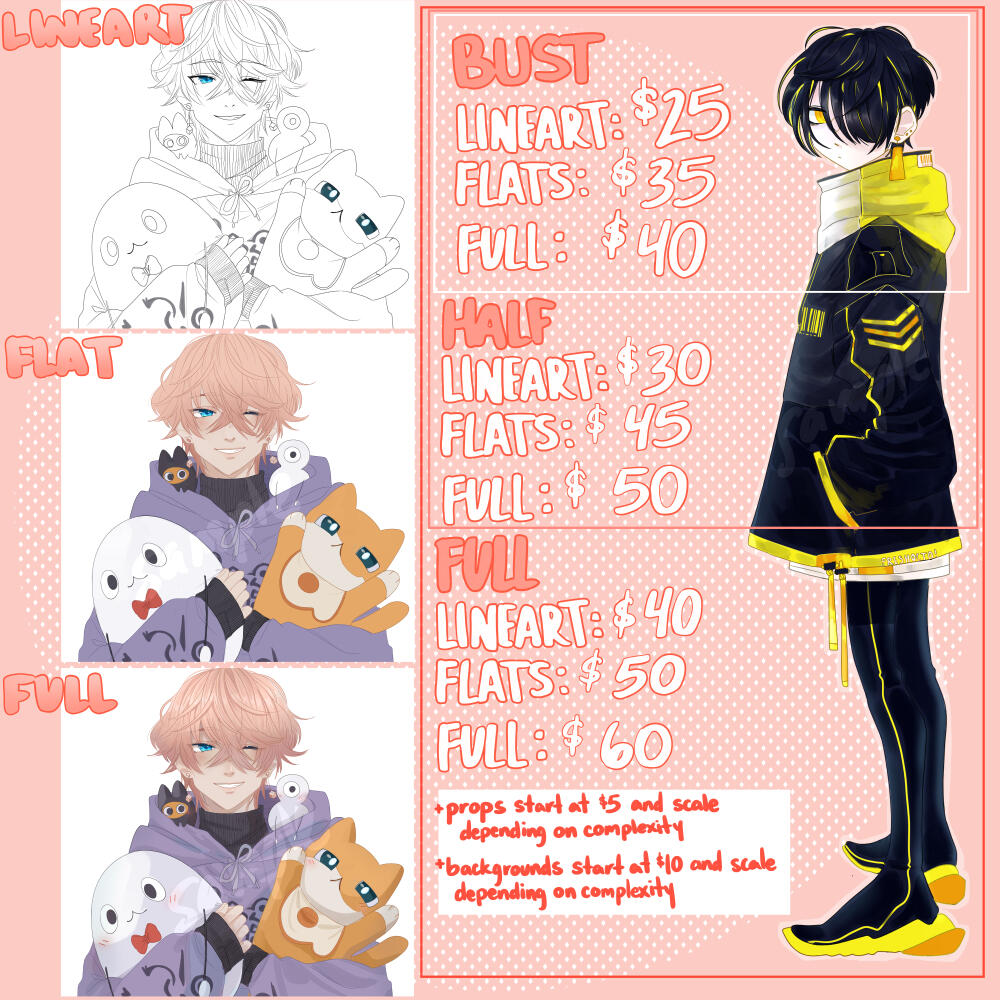 price varies by character and background complexity, additional characters will be an additional charge based on the same complexity, usually ~$30-$50